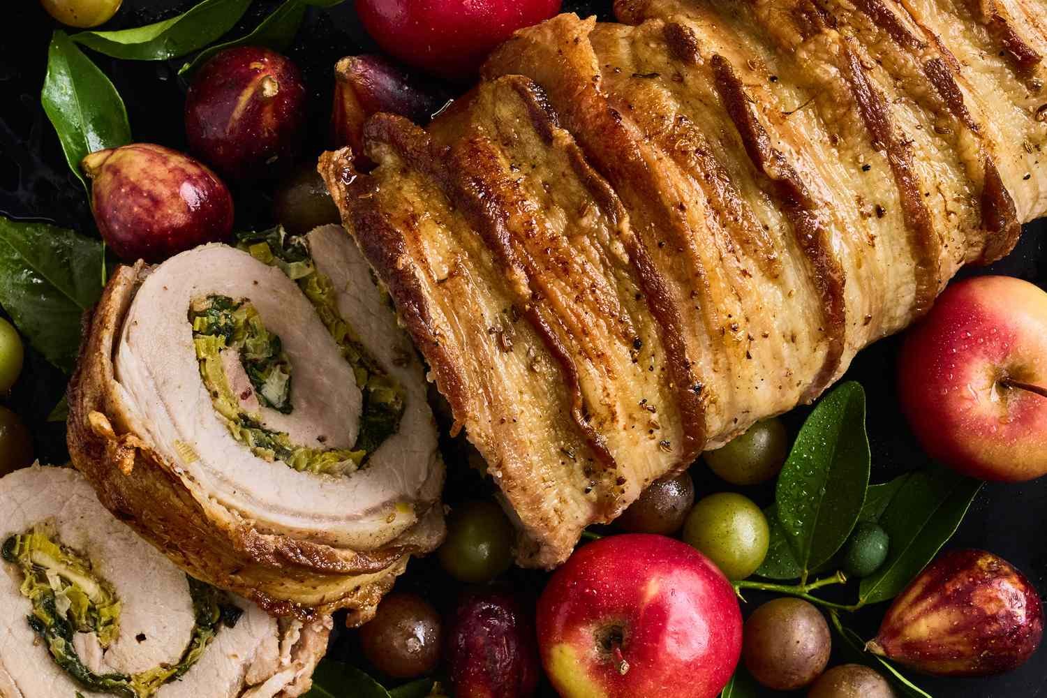 Rich, aromatic, and deeply savory, this stuffed and rolled variation on a classic Italian porchetta is designed for make-ahead ease. It starts with a butterflied pork loin that’s dry-brined with fennel and rosemary, the hallmark flavors of traditional porchetta. Stuffed with sautéed leeks, Swiss chard, Parmesan, and anchovies, and topped with pork belly strips for a crispy crust, the quick-cooking loin goes from oven to table in just an hour.