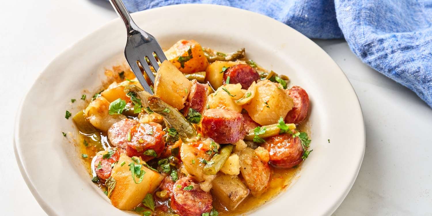“One of the most delicious things I have made in a long time,” Nicole starts us off with Swamp Potatoes and Sausage—a hearty meal packed with potatoes, smoked sausage, green beans, and more. Cook it for six to seven hours and it’s just “divine.”