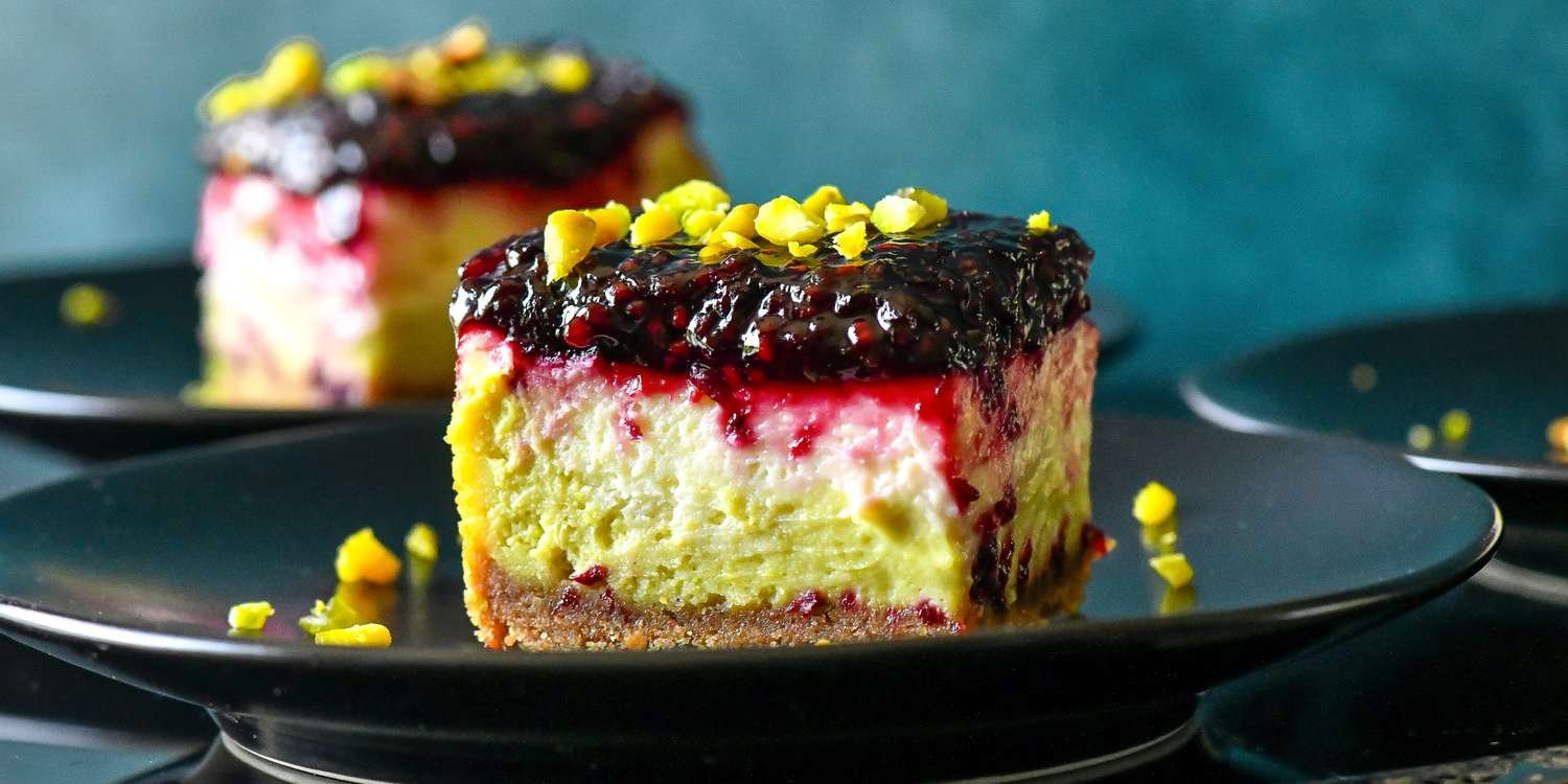 These blackberry pistachio cheesecake bars are not only gorgeous—they are absolutely delicious, as well. Give yourself time to make these, as you want them to be thoroughly chilled before serving (overnight is best). I used homemade pistachio butter in the filling—but store-bought should work just fine.
