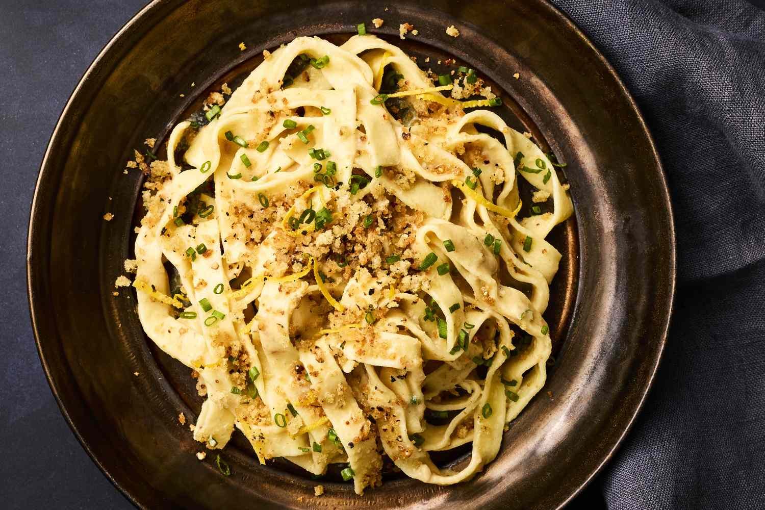 Inspired by a dish he had at Rome’s Roscioli, chef Bobby Flay was struck by how a few ingredients and a simple method could produce a deeply flavorful pasta. At home, he rolls pasta by hand, but store-bought fresh fettuccine saves time and cooks to a tender bite. The sauce’s umami comes from anchovy butter. Chop the fillets, mash them to a paste with a knife, and stir into softened butter. It melts into a glossy sauce that coats the noodles in minutes. While the pasta boils, toasting panko in olive oil with garlic and lemon zest until golden creates a crunchy topping for the pasta. When scattered just before serving, the brightness from the lemon and the crunch from the panko add more bite, while the chives keep things green and lively.