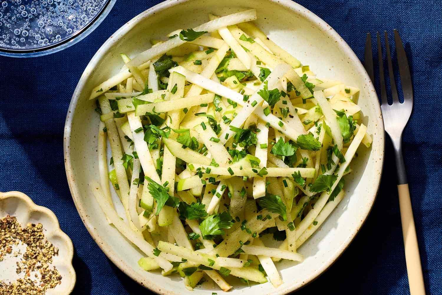 - Freshly chopped cilantro and chives are tossed with julienned celery root, Granny Smith apple, and daikon radish to create a crisp, refreshing slaw.