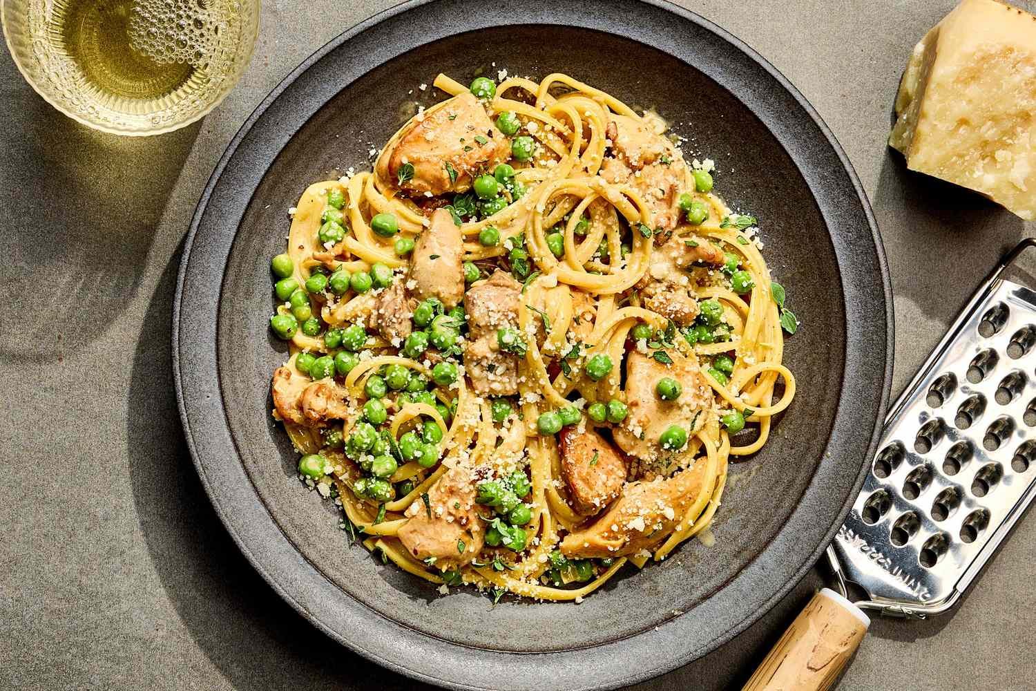 This dish works with both long and short pasta. Choose shapes that grip the creamy, lemony sauce and catch peas and chicken. Linguine, as suggested, offers silky strands that hold the sauce well. Short, ridged cuts such as rigatoni, mezzi rigatoni, cavatappi, gemelli, and campanelle provide nooks for peas and bites of chicken. Orecchiette also works, cupping the sauce in its shallow bowl. Avoid very thin strands, like capellini, which can break under the sauce’s weight.Â