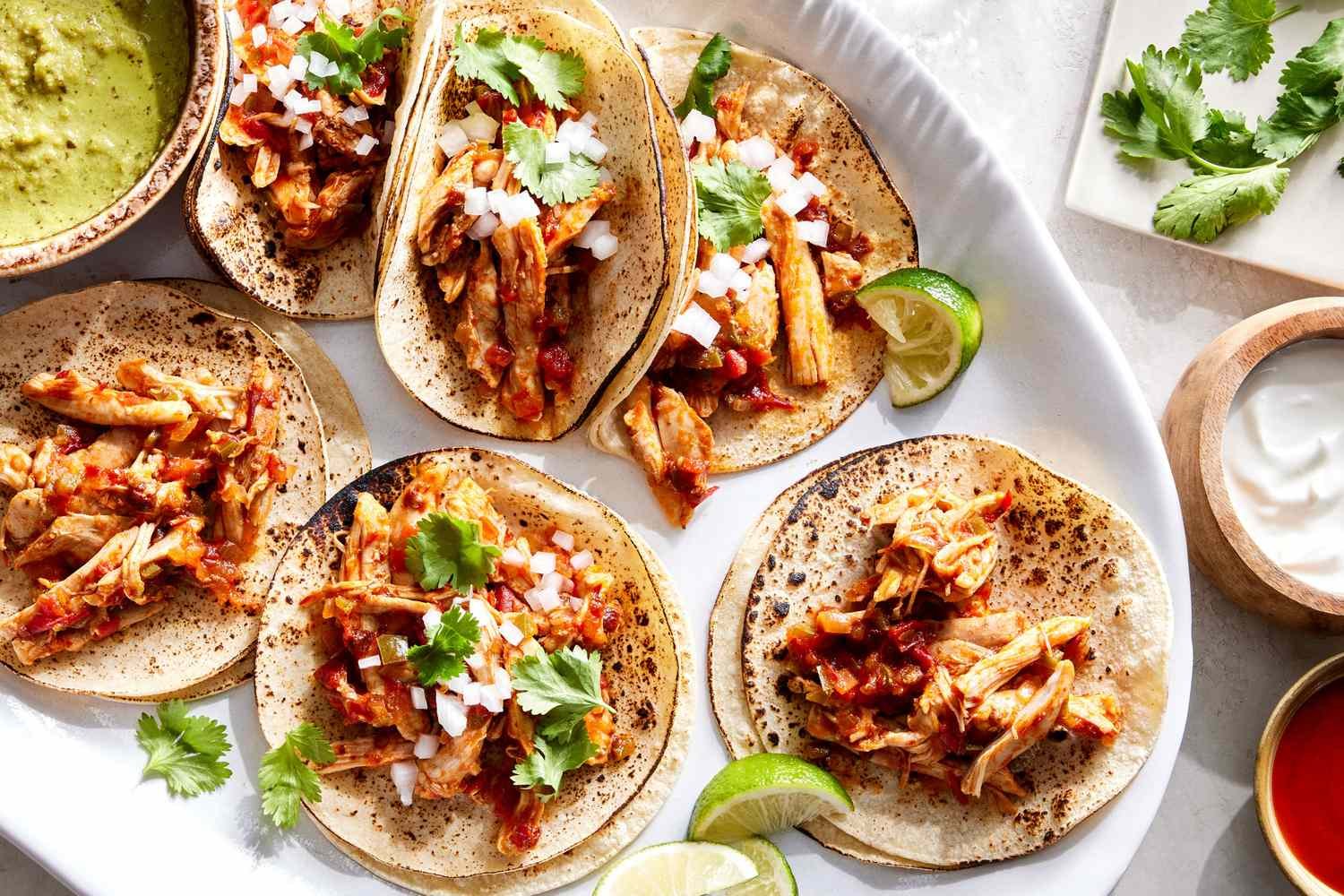 For these flavor-packed tacos, chef Alex Stupak first roasts simply seasoned chicken thighs, then shreds the meat and adds it to the skillet with a tangy, smoky blend of onion, jalapeño, chipotles with adobo sauce, and plum tomatoes to finish the filling. It’s served in warm corn tortillas with sour cream to temper the heat, plus chopped cilantro, onion, and lime wedges.