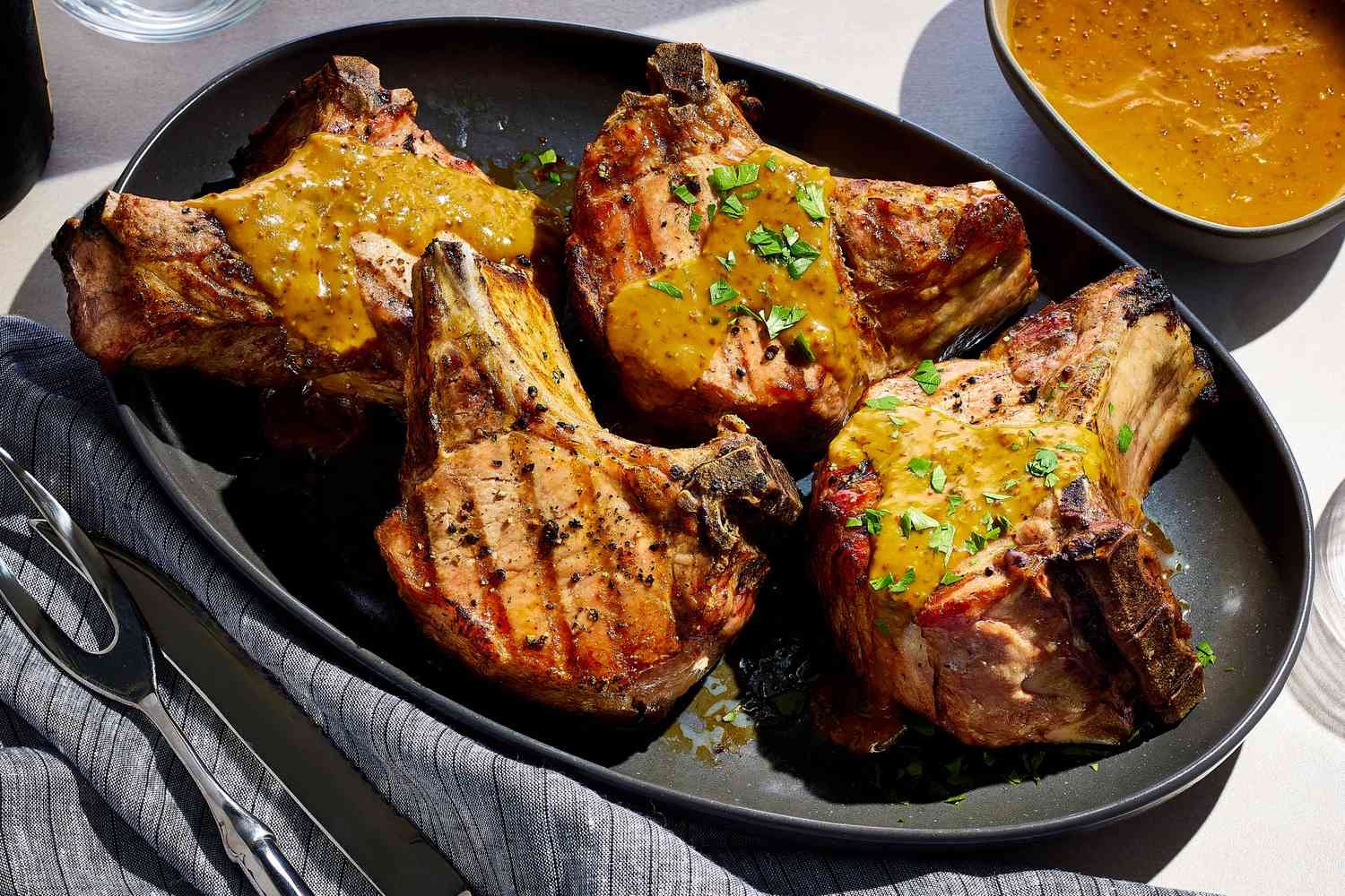 For this hearty entrĂ©e, hefty double-cut pork chops are marinated overnight in a brown sugar–apple cider brine, then hit the grill until nicely caramelized and cooked perfectly medium-well. They’re paired with a bright, sweet-tart sauce made with Tabasco, apple cider vinegar, and two kinds of mustard. Serve the sauce warm with the smoky chops for a perfect late-summer or fall meal.