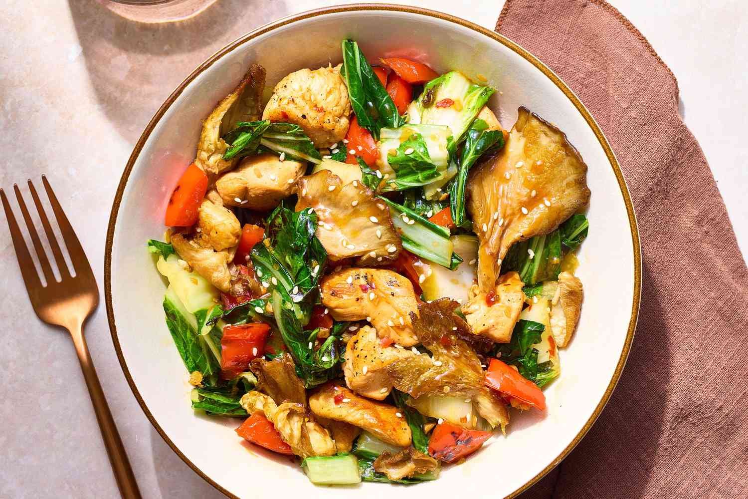 - Oyster mushrooms, bite-sized chicken pieces, crisp‑tender bok choy, and red bell pepper are united in a fragrant ginger‑garlic base before being coated in a glossy sauce that’s perfectly balanced with sweet, savory, tangy, and toasty notes.