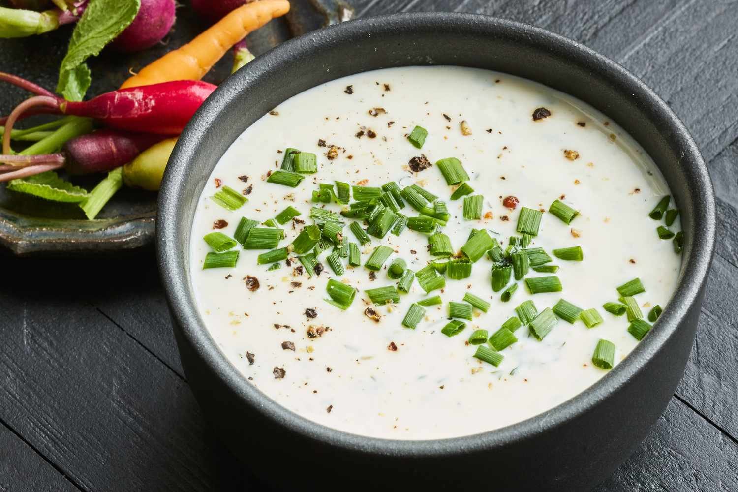 A combination of whole buttermilk, mayonnaise, and sour cream is the key to the dip’s richness. The texture hits the sweet spot: it clings onto crisp cruditĂ©s and can still pour easily over salad or a hot slice of pizza. The acidity from the buttermilk, plus additional lemon juice adds zip throughout while the herbs add a freshness. It still hits all the notes of the old-school ranch we know and love, with a touch more vibrancy and tang.Â