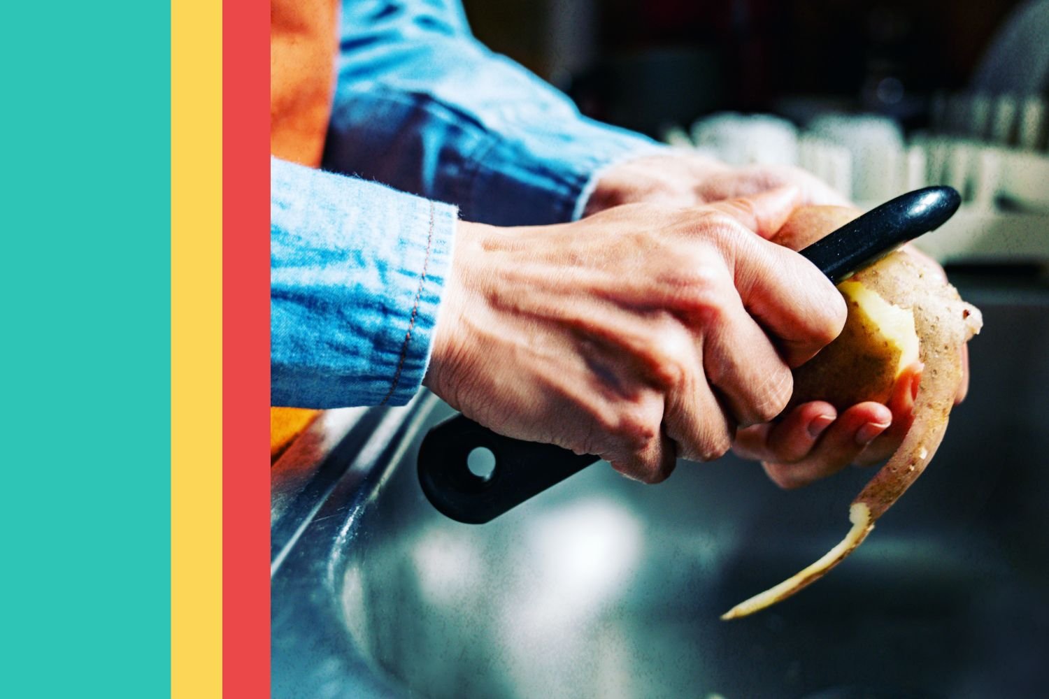OXO’s vegetable peeler has a sharp stainless steel blade on a swivel, so the blade stays flush against the potato no matter what angle you hold it at. After thousands of potatoes, Mom’s OXO peeler is still wickedly sharp. It cuts through tough potato skin like butter. I can fly through a large potato in less than a minute when I’m in the zone.