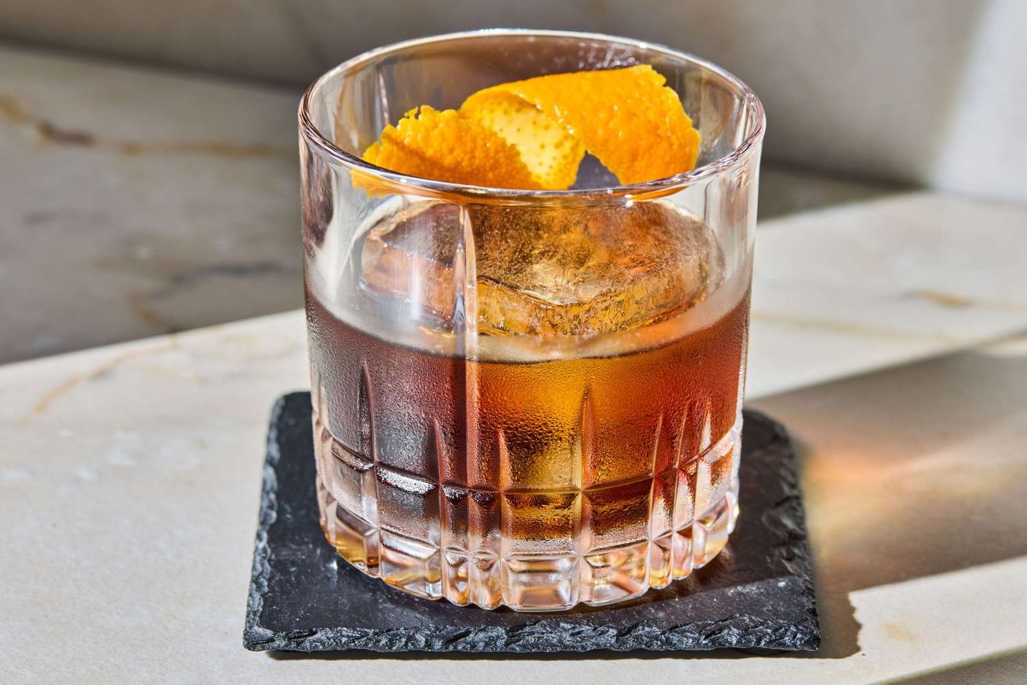 Bourbon provides a sturdy, warming base, but the coffee liqueur leads on aroma and palate. A teaspoon of vanilla syrup smooths the edges and amplifies the whiskey’s inherent vanilla notes. Angostura and orange bitters add spice and lift, while an orange twist sharpens the citrus contrast for a clean, fragrant finish.