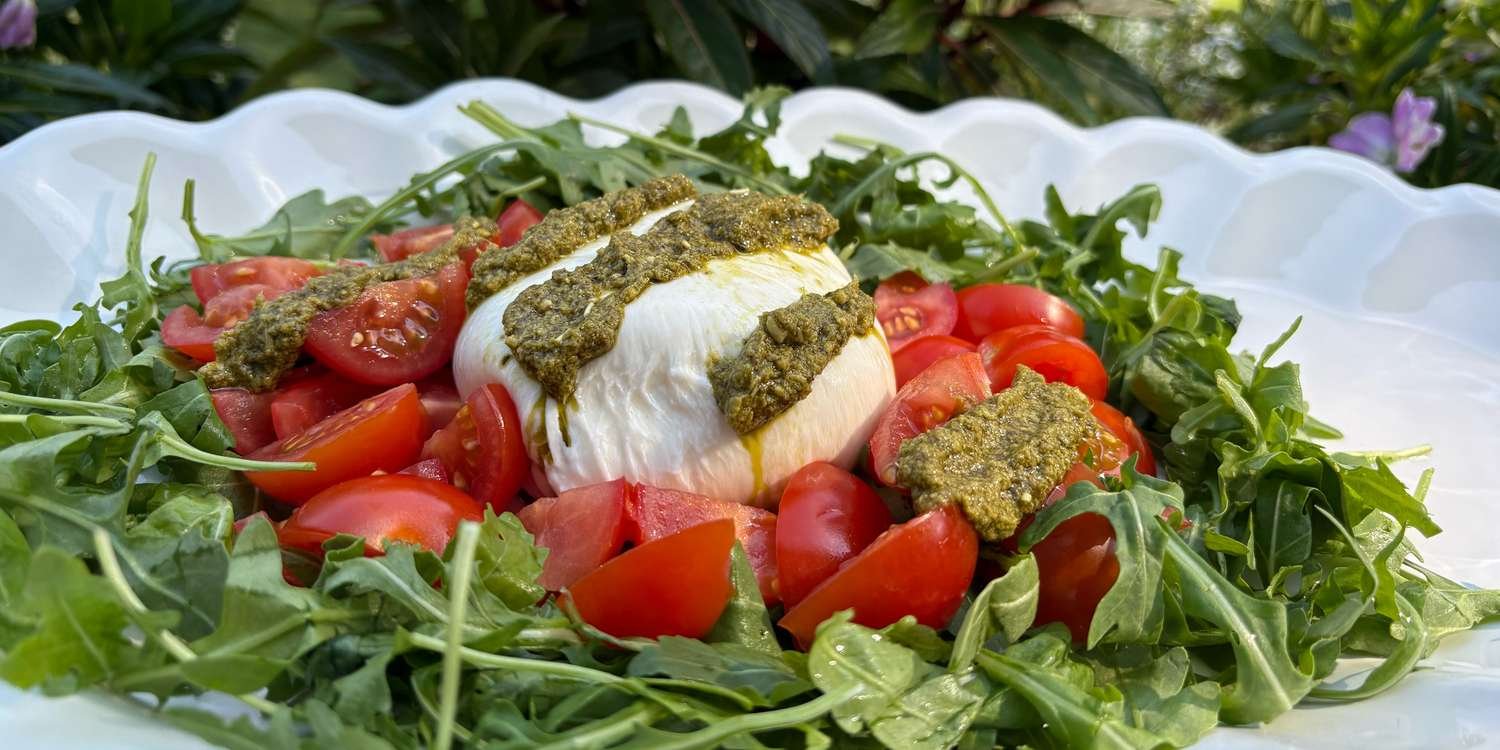 Picture a bed of arugula with creamy burrata, fresh cherry tomatoes perched atop, and a drizzle of pesto to tie everything together. My mom’s salad looks gourmet, but it’s foolproof to prepare. The addition of a burrata ball on top makes the dish extra special.