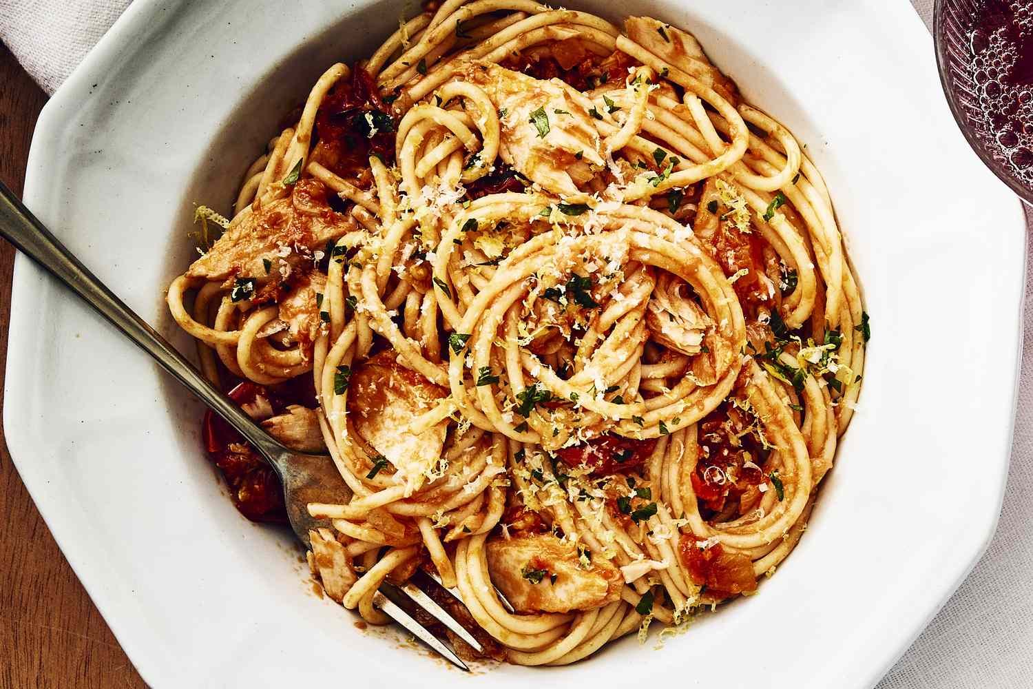 This recipe, featured in her new cookbook, Good Things: Recipes and Rituals to Share with People You Love, relies on pantry staples. Many of the ingredients — like dried pasta, canned tuna, and (more recently) Calabrian chiles — are pantry staples. Her use of canned cherry tomatoes, which burst until jammy, give the sauce a concentrated ripe sweetness that tastes like it has been slow-simmering for hours. And, of course, the final touch of lemon zest and juice stirred into the pasta right before serving lifts and brightens the dish.