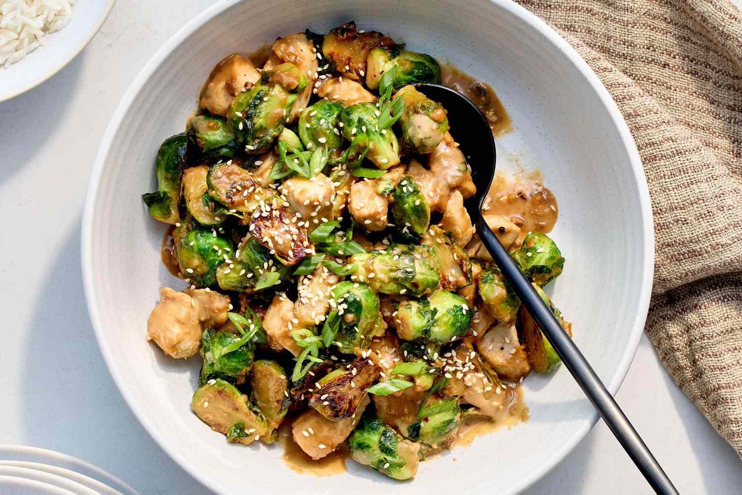 Blanching and stir-frying brussels sprouts is an easy and fast way to cook one of fall and winter’s tastiest vegetables. Here, cookbook author and Food Network host Molly Yeh pairs the sprouts with chunks of chicken breast and a garlicky sesame sauce made with honey, soy, and plenty of tahini. Serve over white rice for a quick and delicious dinner.