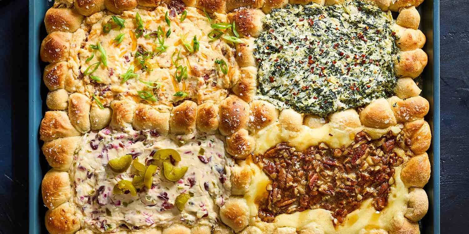 Win major points when you bring this clever, one-and-done appetizer to the party. Cover all your sweet and savory bases by making four different hot and melty dips in a single sheet pan. Dips can be made ahead, chilled, up to 1 day before baking.