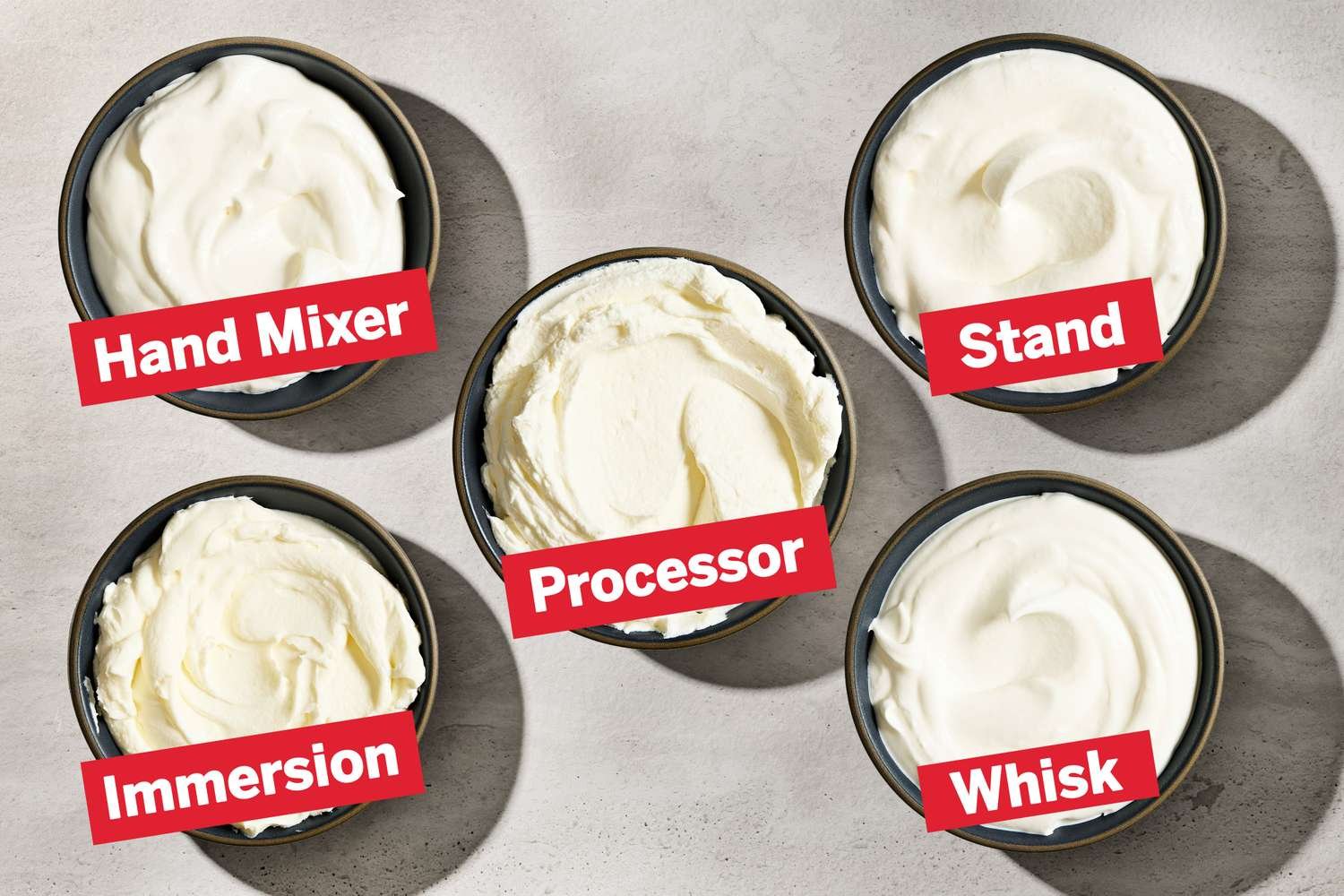 First, I considered the small appliances that most home cooks own. I tested common whipping tools, such as the hand mixer and stand mixer, and less-used options, including a food processor and immersion blender. For good measure, I compared results from each of these to the old-fashioned method of using a bowl, whisk, and forearm strength to whip cream by hand.
