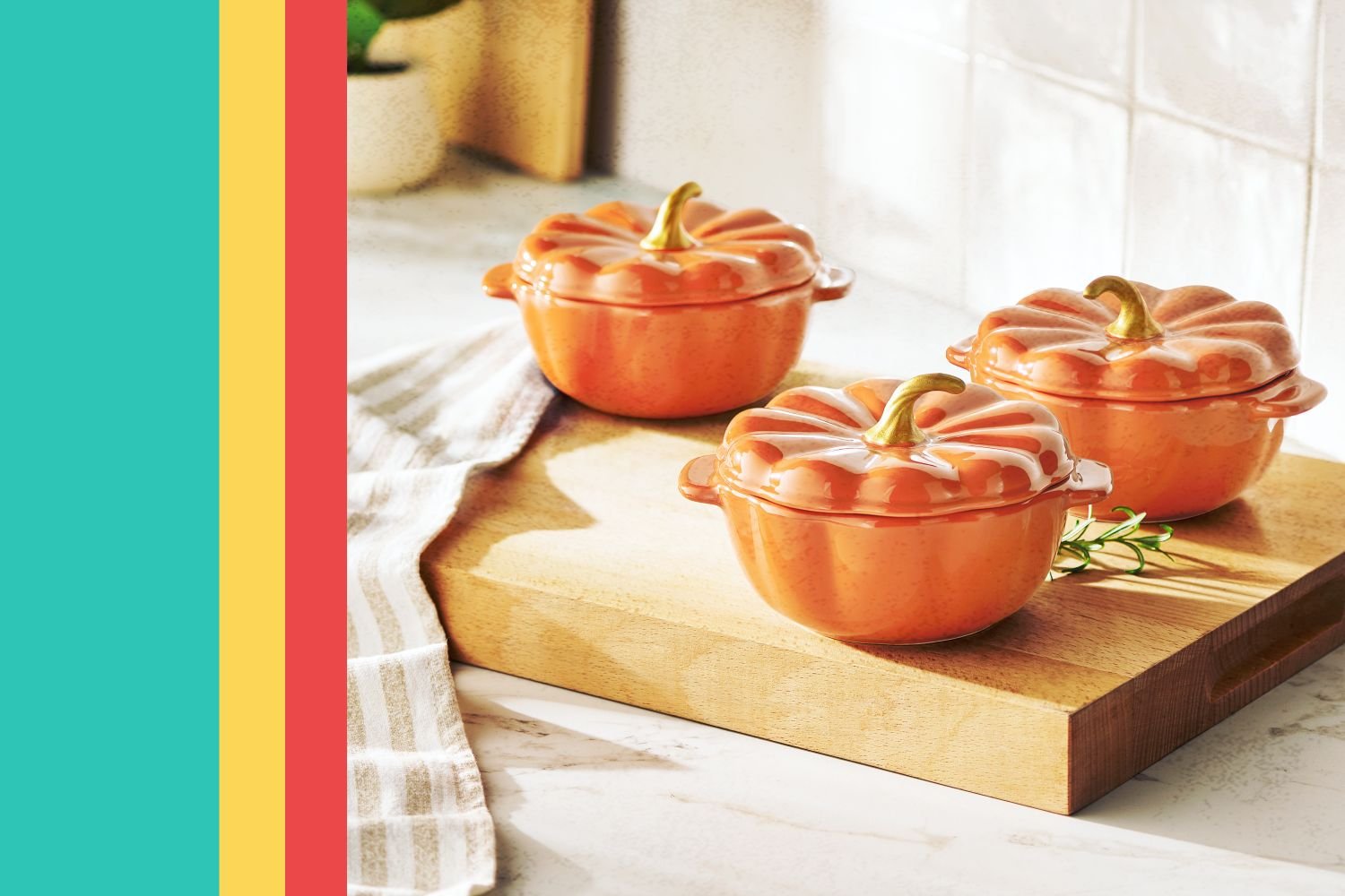 Available in white, green, or vibrant orange, this 2-cup cocotte is shaped like a little pumpkin. Even though it’s certainly festive and fashionable, the stoneware cocotte doesn’t skimp on functionality. It’s oven- and microwave-safe up to 450 degrees Fahrenheit. Imagine serving a side of tomato soup with some gooey grilled cheese, or making some pumpkin hummus for a veggie tray.Â